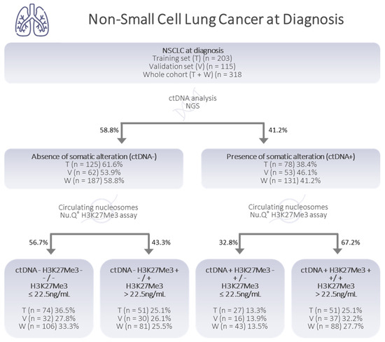 Decision tree proposed for the classification of NSCLC samples at diagnosis. The decision is based on the presence/absence of circulating tumor DNA (ctDNA), and on H3K27Me3-nucleosome levels below or above 22.5 ng/mL, determined via K2-EDTA plasma samples from NSCLC patients at diagnosis. The number of samples (n) is presented for the training set (T; n = 203), the validation set (V; n = 115), and the whole cohort (V + T; n = 318). The percentages expressing the part of the total cohort involved are presented in the boxes. The distribution of sub-groups on either side of the decision tree arms is also shown as a percentage.