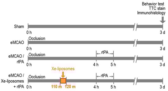 Experimental design of Xe-liposome administration with early treatment of rtPA. Four experimental groups were: sham control, eMCAO with no treatment control, eMCAO with free rtPA, and eMCAO with Xe-liposomes + free rtPA. Xe-liposomes (6.4  mg/rat) were administered 110 min after stroke onset, followed by IV administration of rtPA (10% bolus and 90% infusion) for 60 min to induce reperfusion. Behavioral outcomes were assessed on days 1, 2, and 3 after eMCAO, and infarct size was determined on day 3.