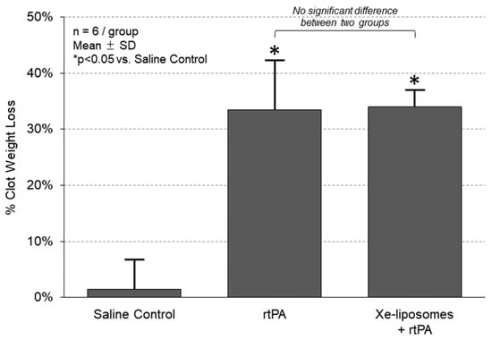 In order to investigate the thrombolytic efficiency of rtPA in the presence of Xe-liposomes, an in vitro clot lysis assay was conducted (Figure 3). Free rtPA treatment revealed a percentage clot weight loss of 34 ± 3.0%. The combination treatment of Xe-liposomes with rtPA achieved an effective clot lysis of 33 ± 8.8%, comparable to that of free rtPA alone. These findings demonstrate the comparable thrombolytic potential of Xe-liposomes with rtPA. The next steps involve assessing the safety and efficacy of this combination in both in vivo and clinical-related settings.