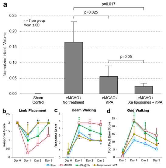 Therapeutic efficacy of Xe-liposomes in combination with early rtPA thrombolysis. (a) Quantitative comparison of infarct size among the groups, and neurological assessments of (b) limb placement, (c) beam walking, and (d) grid walking. n = 7/group, Mean ± SD; * p < 0.05 vs. eMCAO, + p < 0.05 vs. rtPA.