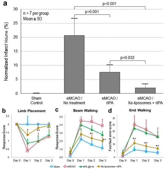 Behavioral deficits were found to correlate with infarct volume outcomes (Figure 5b–d). Animals without any treatment showed major deficits in locomotor performance on day 1 with minimal improvement on subsequent days. It was noteworthy that the animals treated solely with rtPA failed to yield substantial improvements in any behavioral test. However, the animals treated with Xe-liposomes in combination with rtPA demonstrated markedly improved neurological performance across all tests (Figure 5b–d).