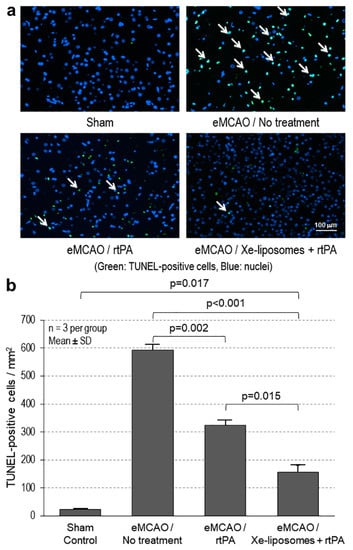 Reduced cell death after ischemic stroke with Xe-liposome treatment. (a) Representative images of the TUNEL-labeled cells in the affected tissue region around the ischemic core of the brain sections from the sham, eMCAO with no treatment, eMCAO with rtPA treatment alone, and eMCAO with Xe-liposomes + rtPA treatment groups. Arrows indicate the examples of the TUNEL positive cells. (b) Quantitative evaluation of the TUNEL-labeled cells.