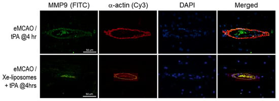 Colocalization of MMP9 immunoreactivity on the cerebral microvascular wall. In the late rtPA treatment group, MMP9 immunoreactivity was observed extensively around the cerebral microvascular wall, co-localizing with α-actin. However, administration of Xe-liposomes along with rtPA showed large reduction in MMP9 immunoreactivity on the microvascular wall.
