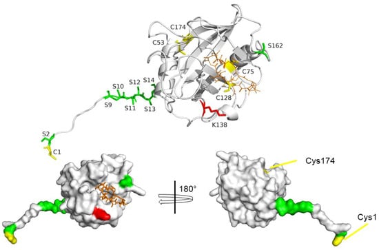 The oxidative modification of CyPD has been investigated in the literature, with a particular focus on cysteine residues [126,128,144,145]. Of the five cysteine residues in the mature CyPD, Cys1 (C30) and Cys128 (C157) are solvent-exposed, while Cys53 (C82), Cys75 (C104), and Cys174 (C203) are more buried (Figure 4). According to the CyPD crystal structure [53,54], no disulfide bonds are observed, although the pairs Cys53-Cys174, located on the back face of the protein, and Cys75-Cys128 on the opposite side of the protein are close to each other. A closer analysis of the X-ray structure reveals that the first cysteine pair also displays a rather favorable side-chain geometry for S-S formation. It was Linard et al. who first reported that CyPD could be oxidized, that upon oxidation PPIAse activity is reduced by 20% and that Cys174 (C203) was the oxidation site [144]. The authors also suggested the formation of the Cys128-Cys174 disulfide bridge, but they could not detect it via mass spectrometry. Indeed, such a disulfide bridge would entail dramatic structural rearrangements of the protein which are quite unlikely to happen, especially considering that both Cys174 and Cys128 have other proximal cysteine residues and that such a conformational reorganization unlikely would retain the PPIase activity.