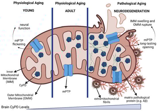 Although CyPD is ubiquitously expressed in human tissues, its expression levels are tightly regulated and vary significantly among different districts [147,148,149]. Indeed, it has been found that while liver [147,148,149] and heart [149] mitochondria undergo CsA-sensitive swelling upon calcium treatment, adult brain mitochondria are highly resistant to this phenomenon [147,148,149], although both liver and brain mitochondria are able to swell, similarly, upon treatment with the channel-forming peptide alamethicin [147]. It was demonstrated that brain mitochondria resistance to swelling depends on the reduced CyPD levels, which were found almost three times lower than in heart and liver mitochondria [149]. More in detail, CyPD expression levels were found downregulated in mature (3-months old) rats when compared to newborn (1-day old) rats [149], which was also associated with different propensities to CsA-sensitive mPTP opening (lower in 3-months mice than in 1-day mice) [149]. Moreover, neuronal precursor PC12 cells treated with the differentiation factor NGF showed a dramatic reduction in CyPD expression level, confirming its differentiation-dependent down-regulation in mature neural cells [149]. Independently, another group found that neural CyPD levels increase during aging in both mice and humans [150,151,152] and that this correlates with calcium-handling capacity [150]. It should also be noted that Ppif−/− mice showed neurological symptoms, i.e., an increase in anxiety-type behavior [153]. This could be both a direct or indirect effect of the absence of CyPD since they also had an abnormal accumulation of white adipose tissue [153] which has been shown to be associated with an increase in anxiety-type behavior [154].