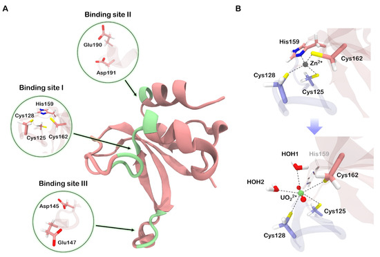 (A) Three metal-binding sites found on zinc finger surface using MIB2 server [13]. (B) Transformations occurring in the native binding site upon substitution of zinc by uranyl ion. HOH stands for water molecules. Quantum partitions (excluding alpha carbons) are drawn opaque.