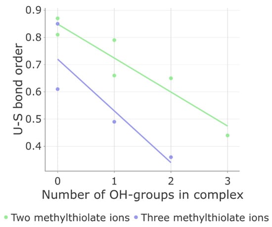 Correlation between Mayer bond order of uranium–sulfur (U–S) bond and ligand content, namely, the number of OH- and CH3S-groups, in uranyl ion complexes.