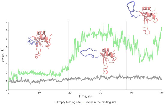 The precise positioning of the N-loop is crucial for DNA recognition, and zinc plays a critical role in maintaining its proper orientation within the protein structure [12]. Therefore, we aimed to investigate the extent to which uranyl ion holds the connection between the N-loop and the protein’s core.
