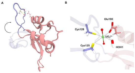 According to our calculations, in the final state (Figure 5B), the bond between uranium and sulfur has a length of 2.77 Å and a bond order of 0.51. In turn, the CCB between uranium and the carboxyl oxygen of Glu190 is relatively short (2.31 Å), but its bond order indicates that it is not very strong, with a value of 0.59. However, if we assume that the OH-group is going to be reprotonated, the U–SCys bond order will increase to 0.68, and U–OGlu—to 0.88. Therefore, from a chemical perspective, the final complex (SIII) should be more stable than the initial one (SI).