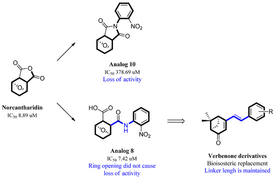 Previous research conducted on cantharidin has yielded valuable insights into its role as an insecticidal agent and its structure–activity relationship. Notably, these studies have demonstrated that replacing the oxygen moiety in the dihydrofuran ring with a nitrogen moiety resulted in the loss of the compound’s insecticidal activity (Figure 1) [5,7]. This emphasizes the critical importance of the oxygen atom for cantharidin’s biological activity. Interestingly, it has been observed that opening the dihydrofuran ring does not lead to a similarly significant loss of insecticidal activity. This suggests that modifications to the dihydrofuran ring can be explored without fully compromising the compound’s insecticidal properties.