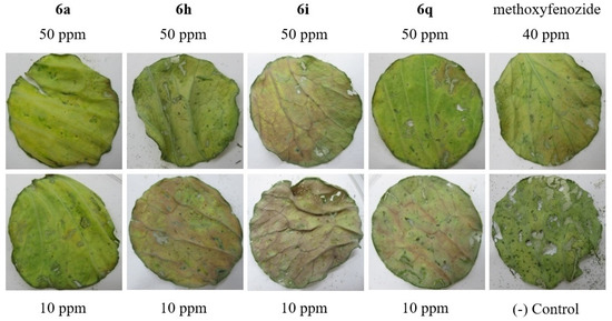 Cabbage leaves treated with compounds 6a, 6h, 6i, and 6q incubating P. xylostella after 4 days.