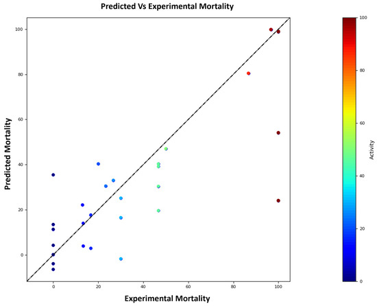 Relationship between experimental and predicted mortality (%); R2 = 0.94, p = 1.07 × 10−9, and MPE = −5.48%.