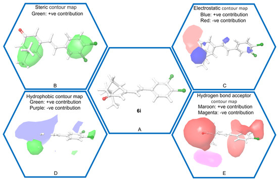 QSAR contour map. (A) 3D structure of the chosen representative compound (compound 6i), (B) Steric contour map (green is positive), (C) Electrostatic contour map (blue is positive and red is negative), (D) Hydrophobic contour map (green is positive and purple is negative), (E) H−bond acceptor map (maroon is positive and magenta is negative).