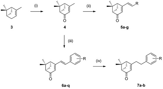 All (R)-verbenone derivatives were also synthesized utilizing the synthetic strategy demonstrated in Scheme 2. This strategy included oxidation of (+)-α-pinene (3) into (R)-(+)-verbenone (4) using N-hydroxyphthalimide and chromium trioxide, followed by aldol condensation with various heterocyclic and aromatic aldehydes using KOH as a base in MeOH to afford products 5a–g and 6a–q in moderate to high yields. Compounds 7a and 7b were synthesized by hydrogenation of parent compounds 6a and 6q using Pd/C in ethyl acetate at room temperature.