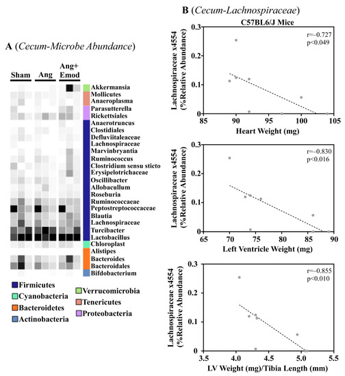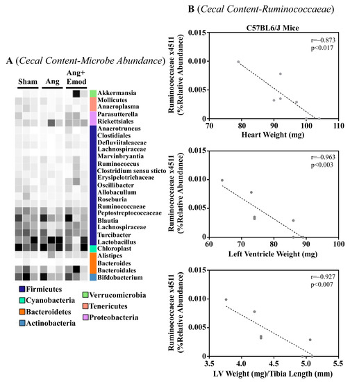 Angiotensin II-induced changes in the cecum microbiome were altered with emodin treatment. Ten-week-old C57BL6/J male mice were treated with vehicle (DMSO:PEG 200), angiotensin II (Ang) (1.5 g/kg/min), or Ang + emodin (Ang + Emod; 30 mpk). Cecal content was removed and cecum collected for 16S rRNA sequencing. (A) A heatmap showing changes in the microbiome and (B) Spearman correlation analysis performed to identify bacteria that negatively correlated with heart weight, left ventricle (LV) weight, and LV weight normalized to tibia length (LV/TL). Color intensity indicates abundance in the heatmap, with darker colors representing more abundance.