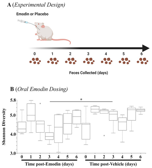 Fecal microbial diversity was attenuated with emodin. (A) Ten-week-old C57BL6/J mice were gavaged with vehicle control (DMSO:PEG) or emodin (30 mpk) daily with feces collected daily. (B) Shannon diversity analysis was performed using QIIME software for days 0–6 of the experiment comparing emodin (n = 4) vs. vehicle control (n = 5) (day 3, H = 4.9, * p = 0.0275).