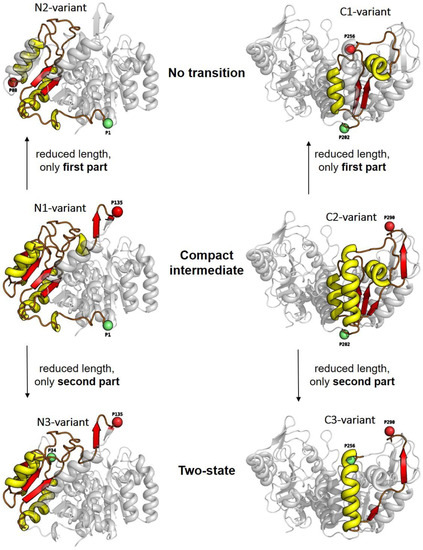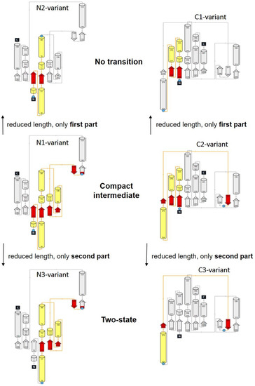 In order to establish a possible link between the folding schemes found and the structural elements enclosed between the two dye attachment positions, we chose a special point of view of the yPGK structures involved. Here, the enclosed structural elements were highlighted and positioned within the corresponding domain for each variant (Figure 3). A closer look at this arrangement allows the following observations: (i) The variants with the largest numbers of amino acid residues between the dye attachment positions, i.e., N1-variant (1–135) and C2-variant (202–290), exhibited compact intermediate unfolding transitions. (ii) If the number of residues was reduced and one included only the first part (i.e., upstream with respect to the sequential order) of those residues which were enclosed in the N1- and C2-variants, we obtained the N2-variant (1–88) and the C1-variant (202–256). Both of these variants showed an unfolding transition which was classified by the “no transition” type. (iii) Another reduction in the number of residues, again with respect to those of the N1-and C2-variants, but including the second part (i.e., downstream with respect to the sequential order) obtained the N3-variant (34–135) and the C3-variant (256–290). Again, these two variants also exhibited the same type of unfolding transition, this time with two-state unfolding. Such a systematic behavior indicates a special assignment between the different properties of the unfolding transition and the different inter-dye distances measured for the individual variant.