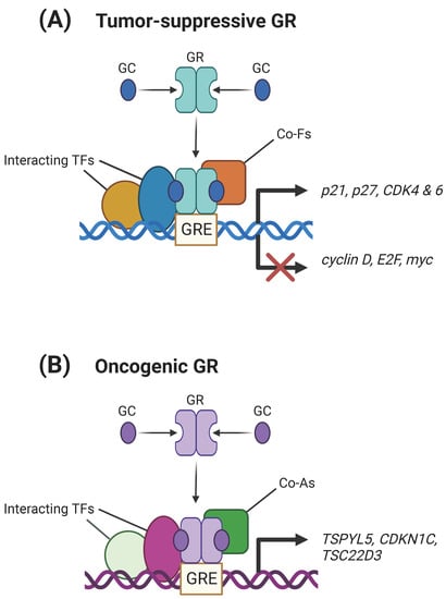 The role of the GR in NSCLC biology. (A) The tumor-suppressive properties of the GR include the upregulation of genes involved in cell cycle arrest (e.g., p21 and p27) and the downregulation of genes associated with cell cycle progression (e.g., cyclin D) [11,12]. (B) The oncogenic functions of the GR include the induction of genes that promote cancer cell growth and migration (e.g., TSPYL5) [17]. Co-As, co-activators; Co-Fs, co-factors (co-activators or co-repressors); GC, glucocorticoid; GR, glucocorticoid receptor; GRE, glucocorticoid response element; TFs, transcription factors. This figure was created using the tools provided by BioRender.com (accessed on 17 August 2023).