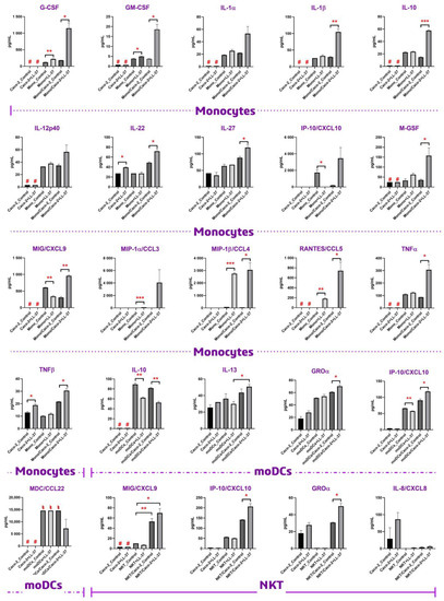 Profiles of cytokines, chemokines, and growth factors levels secreted by human Caco-2 epithelial cells, monocyte-derived dendritic cells (moDCs), NKT cells, and primary blood monocytes in response to stimulation with 1 μM LL-37 (4.5 μg/mL) for 24 h. Error bars represent a standard deviation (±SD) between two replications; # indicates values that fall below the lowest detectable limit; and ♮ indicates values that fall above the highest detectable limit. Significance levels are: * p < 0.05, ** p < 0.01, *** p < 0.0005.