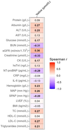 Heatmap of correlations of valine serum levels with laboratory and clinical parameters. Values presented are the Spearman correlation coefficients. p-values < 0.05 were considered significant and are depicted in bold. SPAP was measured in 259 patients; other analyses were based on 315 samples. ALT, alanine aminotransferase; AST, aspartate aminotransferase; BUN, blood urea nitrogen; CK, creatine kinase; CRP, C-reactive protein; eGFR, estimated glomerular filtration rate; HDL-C, high-density lipoprotein cholesterol; hsTnI, high-sensitivity troponin I; IL-6, interleukine-6; LDH, lactate dehydrogenase; LDL-C, low-density lipoprotein cholesterol; LVEF, left ventricular ejection fraction; MAP, mean arterial pressure; NT-proBNP, N-terminal pro-brain natriuretic peptide; SPAP, systolic pulmonary artery pressure; TC, total cholesterol.