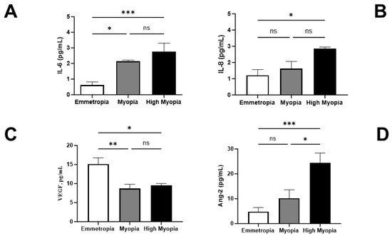 IL-6, IL-8, VEGF-A, and ANG-2 protein levels in AH. Biosamples were collected and categorized according to axial length (AL) elongation (see MM). Microfluidic analysis detected increasing protein levels of IL-6 (A), IL-8 (B), and ANG2 (D) in high myopia and myopia subgroups as compared to emmetropia ones. All changes were AL-elongation-dependent. By contrast, VEGF-A levels (C) were reduced in myopia and high myopia with respect to emmetropia, and no difference was detected in myopia groups. IL-6, IL-8, and ANG2 levels were different between high myopia and myopia, but only ANG-2 levels were significant (D). Significant levels are shown in the panels (ns, not significant; * p ≤ 0.05; ** p ≤ 0.005; *** p ≤ 0.0005), as calculated using one-way ANOVA followed by a Tukey–Kramer post hoc test (mean ± SEM).