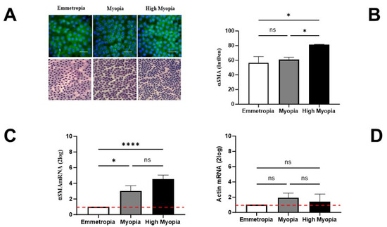 Lens epithelial cells (LECs) display α-smooth muscle actin (α-SMA) phenotypes and synthesize αSMA transcripts. AC/LEC specimens were prefixed at the time of sampling and subjected to specific analysis. (A) Representative α-SMA (merge: α-SMA/green and dapi/blue; epifluorescence) and PAS (light microscopy) images are shown. From left to right: upper panels: α-SMA/dapi immunoreactivity (upper panels); lower panels: PAS staining (lower panels) in emmetropia, myopia, and high myopia (magnifications, ×200; white bar, 100 µm). (B) Increased α-SMA immunoreactivity was quantified in highly myopic samples, as compared to myopic and emmetropic ones (* p < 0.05). IntDen values were obtained using ImageJ software after the channel split and the background normalization of images. (C) Molecular analysis showing increased α-SMAmRNA expressions in highly myopic (**** p < 0.0001) and myopic (p > 0.05) samples, as compared to emmetropic ones used as the control and referred to as 1 (white box; red-dotted line). (D) No changes in actin transcripts were detected between subgroups. (B–D) Significant levels are shown (data ± SEM) as calculated using one-way ANOVA analysis (ns, not significant; * p ≤ 0.05; **** p ≤ 0.0001).