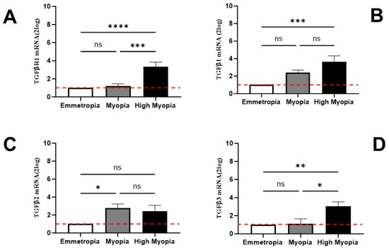 LECs synthesized transcripts specific for TGFβR1 and TGFβ isoforms. LECs were extracted and subjected to real-time RT-PCR. Differences between high myopia and myopia are shown for TGFβ-R (A), TGFβ1 (B), TGFβ2 (C), and TGFβ3 (D) and indicated by asterisks, as calculated using one-way ANOVA analysis. Note the significant increase in mRNAs specific for TGFβ-R (A) TGFβ1 (B) and TGFβ3 (D) in high myopia vs. emmetropia. Data are 2log-FC (fold changes, ±SEM), as calculated with respect to emmetropic eyes used as controls and referred to as 1 (white box). Red-dotted lines indicate the level of significance for relative PCR. Significant levels are shown as calculated using one-way ANOVA analysis (ns, not significant; * p ≤ 0.05; ** p ≤ 0.005; *** p ≤ 0.0005; **** p ≤ 0.0001).