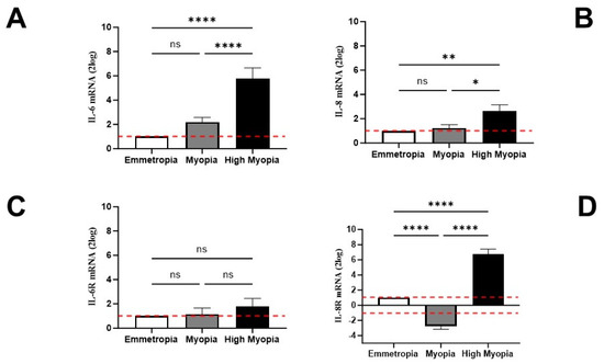 LECs synthesize transcripts specific for IL-6 and IL-8 proteins and related receptors. LECs were analyzed for the specific amplification of IL-6 (A) and IL-8 (B) transcripts, and their specific IL-6R (C) and IL-8R (D) receptors were analyzed using relative real-time RT-PCR. A significant transcript expression was observed for IL-6 (A) and to a lesser extent for IL-8 (B). Of interest, no changes were quantified for IL-6RmRNA (C) with respect to IL-8RmRNA transcription that was significantly upregulated in high myopia (D). Data are 2log-FC (fold changes, ± SEM), as calculated with respect to emmetropic eyes used as controls and referred to as 1 (white box). Red-dotted lines indicate the level of significance for relative PCR. Significant levels are shown as calculated using one-way ANOVA analysis (p value summary: ns, not significant; * p ≤ 0.05; ** p ≤ 0.005; **** p ≤ 0.0001).