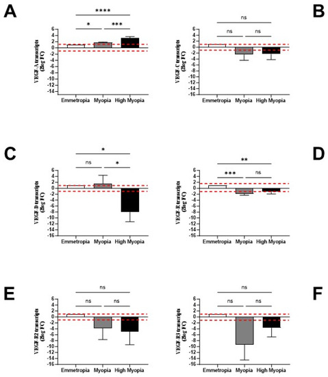 LECs synthesize transcripts specific for VEGF isoform proteins and related receptors. LEC samples were processed, and the specific amplification of VEGF isoform proteins (A–C) and their specific VEGF-R1 (D), VEGF-R2 (E), and VEGF-R3 (F) receptor transcripts were analyzed using relative real-time RT-PCR. While slight changes were detected for VEGF-R1 (D), consistent transcript deregulation was observed for VEGF-R2 (E) and particularly VEGF-R3 (F) in myopia and high myopia. REST-ANOVA analysis was performed to obtain fold change (FC ± SEM) expression for each subgroup with respect to the emmetropic ones used as a control (herein referred as 1, white box). p-values are reported (ns, not significant; * p ≤ 0.05; ** p ≤ 0.005; *** p ≤ 0.0005; **** p ≤ 0.0001), as calculated using REST-ANOVA coupled analysis. Red-dotted lines indicate the level of significance for relative PCR.