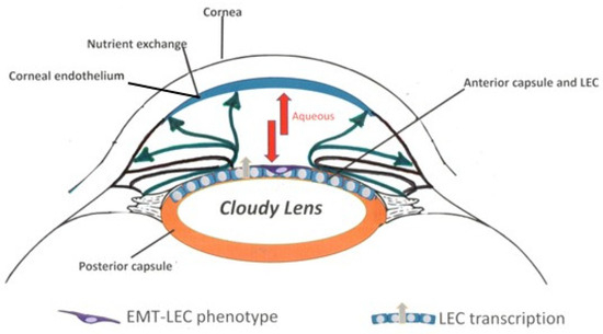 Physiologically, the AH protein signature is the result of i. passive blood flow diffusion and ultrafiltration during ciliary processes and ii. active secretion by the two epithelial layers (secretory cells). Therefore, differences in the composition between plasma and AH are due to the blood–aqueous barrier and are influenced by systemic states. Impairments in the blood–aqueous barrier have been suggested in cases of uveitis and degenerative high myopia. While the blood–aqueous barrier’s breakdown allows the entering of inflammatory cells and soluble mediators during uveitis, the blood–aqueous barrier looks intact in young high myopia with healthy vitreous and fundus [55,56]. This would imply that an active production of mediators might exist inside the anterior chamber, reinforcing the contribution of EMT-LECs. A schematic representation of AH circulation with possible mechanisms occurring inside the anterior chamber is illustrated relative to our results (Figure 7).