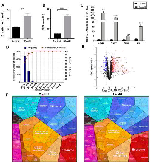 A global proteomic view of the septic kidneys. (A) Serum creatinine and (B) blood urea nitrogen (BUN) levels in the sepsis-associated acute kidney injury (SA-AKI) mice compared with the control mice (n = 5; mean ± SEM). (C) mRNA expression of Lcn2, Kim1, Tnfa, and Il6 in SA-AKI kidney tissue compared to that of the control kidneys (n = 5; mean ± SEM). (D) Experimental variations of proteomics analysis of kidney tissue in mice with SA-AKI and control mice. (E) A volcano plot was created to visualize the differences in the protein expression levels between the kidney tissues of the SA-AKI and control mice, with blue and red dots representing downregulated and upregulated proteins, respectively. The proteins exhibiting significant differences (p-value < 0.05; ratios of ≤0.75 or ≥1.33) are highlighted. (F) Proteomaps of SA-AKI kidney tissue compared with the control group. The polygons in proteomaps consist of proteins, with the size representing protein abundance. Proteins belonging to the same category are placed in adjacent locations [33]. **** p < 0.0001, *** p < 0.001, and ** p < 0.01.