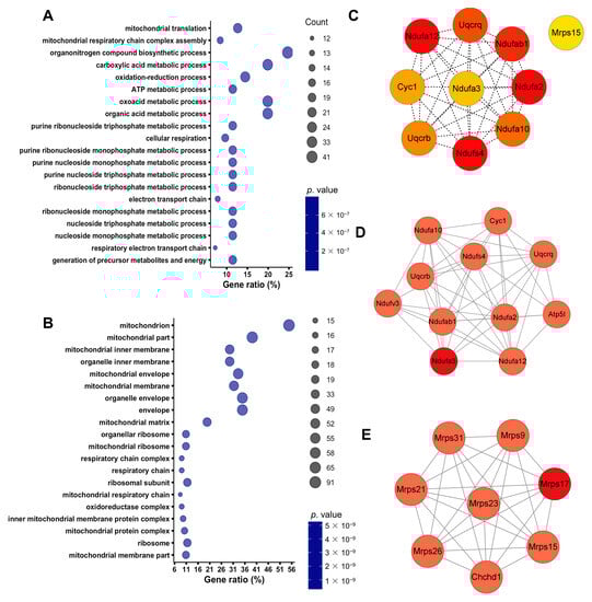 Mitochondrial homeostasis disordered in SA-AKI kidneys. (A) The biological process and (B) cellular component enrichment of downregulated proteins in the SA-AKI kidneys analyzed by Gene Ontology (GO) with DAVID 2021. (C) A total of 10 hub proteins were identified by Cytohubba via the maximal clique centrality method (Red represents a higher score, while yellow represents a lower score). (D,E) Top two PPI (protein and protein interaction) networks analyzed by MCODE. The first cluster had 11 nodes and 47 edges (score = 9.4). The second cluster had 8 nodes and 47 edges (score = 8).
