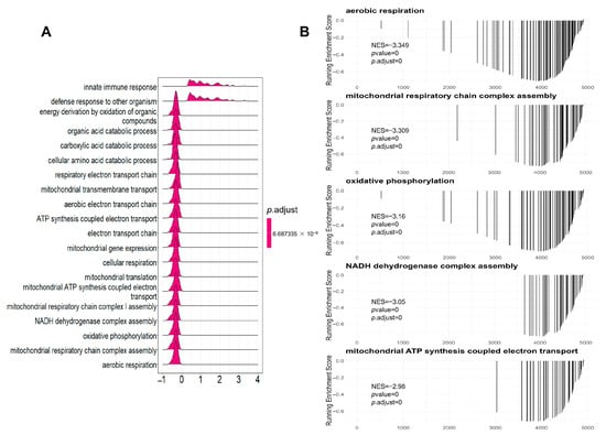 Gene set enrichment analysis (GSEA) is a powerful method that allows for the identification of coordinated changes in groups of genes, which can identify subtle but coordinated changes in gene expression that may be missed by other methods [35,36]. We conducted a GSEA analysis of all of the identified proteins by clusterProfiler v4.6.2 [27]. Our analysis showed that the top 20 pathways with significant differences in the GO database mainly concerned mitochondrial respiratory chain complex assembly, energy derivation by the oxidation of organic compounds, the innate immune response, and defense responses against other organisms (Figure 3A). Specifically, ATP synthesis-coupled electron transport, cellular respiration, mitochondrial respiratory chain complex assembly, NADH dehydrogenase complex assembly, and oxidative phosphorylation pathways were significantly downregulated. The top five pathways, according to the GSEA normalized enrichment score (NES), were aerobic respiration, mitochondrial respiratory chain complex assembly, oxidative phosphorylation, NADH dehydrogenase complex assembly, and mitochondrial ATP synthesis coupled electron transport (Figure 3B). All five pathways were significantly downregulated, and the cneplot revealed shared genes between the top five enrichment pathways (Figure S2). Consistent with the GO analysis, the GSEA analysis using the KEGG database also showed significant downregulation of the oxidative phosphorylation, citrate cycle, and fatty acid metabolism pathways (Figure S3A–C). These results provided strong evidence of mitochondrial dysfunction in sepsis renal injury. In addition, we found that the peroxisome pathway, which is essential for the turnover of complex lipids and reactive species, was downregulated (Figure S3D). Peroxisomes have been identified as regulators of oxidative stress during infection [37]. Therefore, downregulated peroxisome metabolism may contribute to oxidative stress and thus aggravate renal injury.