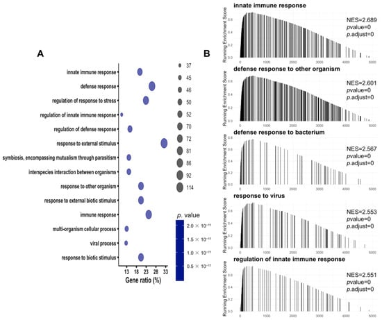 To investigate the upregulated proteins in the SA-AKI kidneys, we performed biological process enrichment via GO analysis. The results showed that immune-related pathways were significantly enriched in the SA-AKI kidneys (Figure 4A), with the top 12 terms determined according to the GO z-score and visualized using the GOChord, GOHeat, and GOCluster plots (Figure S4) [28]. Consistent with the GO analysis, the GSEA analysis revealed that the top five upregulated pathways in the GO database were the innate immune response and defense responses to other organisms, such as bacteria and viruses (Figure 4B). The top five upregulated pathways in the KEGG database included complement and coagulation cascades, herpes simplex virus-1 infection, Epstein–Barr virus infection, antigen processing and presentation, and phagosomes (Figure S5). Immune pathways were activated to adapt to the infection conditions upon septic injury in the kidneys.