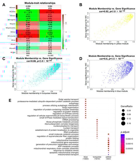 The co-expression network of proteins in SA-AKI kidneys constructed by weighted gene co-expression network analysis. (A) Heatmap illustrates the relationships between modules and the SA-AKI trait. Each row corresponds to a module, and each cell contains the correlation as well as the corresponding p-value in the bracket. (B–D) A scatterplot of module membership vs. gene significance with respect to SA-AKI in the yellow, turquoise, and blue modules. Gene significance (the absolute value) represents associations of individual genes with the SA-AKI trait. Module membership represents the correlation between each module and the gene expression profile. (E) GO analyses of the proteins in yellow, turquoise, and blue modules.