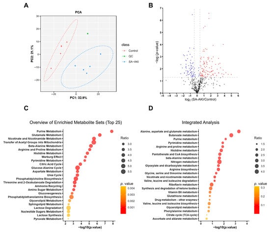 Metabolomic profiling of the septic kidneys. (A) Principal component analysis (PCA) of metabolites showed that metabolites in SA-AKI and control kidneys were different. QC, quality control. (B) A volcano plot was generated to visualize the differences in metabolite levels between SA-AKI kidney tissue and control kidney tissue, with blue and red dots representing downregulated and upregulated metabolites, respectively. The metabolites exhibiting significant differences (p-value < 0.05; ratios of ≤0.75 or ≥1.33) were highlighted. (C) The top 25 enriched metabolite sets were analyzed by MetaboAnalyst 5.0. (D) The integrated analysis of proteomics and metabolomics data was performed by MetaboAnalyst 5.0.