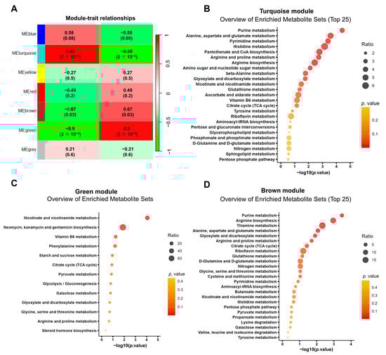 The co-expression network of metabolites in SA-AKI kidneys was constructed by weighted gene co-expression network analysis. (A) Heatmap shows module–SA-AKI trait associations. Each row corresponds to a module, and each cell contains the correlation as well as the corresponding p-value in the bracket. (B–D) Enrichment analysis with MetaboAnalyst 5.0 of the metabolites in turquoise, green, and brown modules.