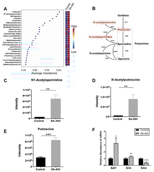 Catabolic products of polyamines increased in septic kidneys. (A) Multivariate exploratory receiver operating characteristic (ROC) analysis was performed with MetaboAnalyst 5.0. Candidate biomarker metabolites were ranked according to their average importance scores. (B) Schematic graph of polyamine catabolism. ODC, ornithine decarboxylase; SMS, spermine synthase; SRM, spermidine synthase; SAT1, diamine acetyltransferase 1; SMOX, spermine oxidase; PAOX, peroxisomal N (1)-acetyl-spermine/spermidine oxidase. Metabolites in red fonts represent those upregulated in the SA-AKI kidneys. (C–E) Metabolite intensity of N1-acetylspermidine, N-acetylputrescine, and putrescine in the SA-AKI and control kidneys. (F) mRNA expression of Sat1, Srm, and Sms in SA-AKI kidney tissue compared with the control group. n = 5, mean ± SEM; *** p < 0.001, ** p < 0.01, and * p < 0.05; ns: no significance.