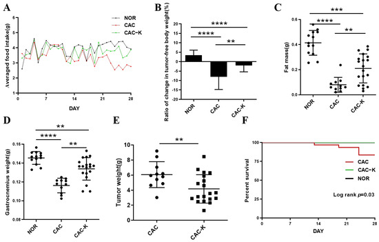 EHB administration alleviated cachectic symptoms in the mouse model of colon cancer cachexia. (A) Food intake curve; (B) ratio of change in tumor-free body weight (%); (C) epididymal fat mass; (D) gastrocnemius weight; (E) tumor weight; (F) survival curve. NOR, normal mice (n = 13); CAC, cachexia mice (n = 11); CAC-K, 3-HB-treated cachexia mice (n = 19). Experimental data are presented as mean ± SD. Statistical significances: p < 0.01, **; p < 0.001, ***; p < 0.0001, ****.