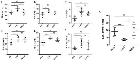 EHB administration decreased serum levels of inflammation factors and total antioxidant capacity in colon cancer cachexia mice. Pairwise comparisons between NOR and CAC and between CAC-K and CAC for serum levels of (A–F) inflammation factors including IFN-γ (A), TGF-β (B), IL-1 (C), IL-6 (D), TNF-α (E), TLR-4 (F), and (G) total antioxidant capacity (TAC) in gastrocnemius. Experimental data are reported as mean ± SD. Statistical significances: p > 0.05, ns; p < 0.05, *; p < 0.01, **; p < 0.001, ***.