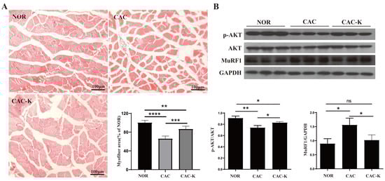 EHB-administration ameliorated skeletal muscle atrophy in the mouse model of colon cancer cachexia. (A) Hematoxylin–eosin staining in gastrocnemius muscle and quantitative comparisons of cross-sectional areas of skeletal muscle fibers for NOR vs. CAC and CAC-K vs. CAC (n = 6). (B) Expressions of p-AKT, AKT, MuRF1 in gastrocnemius, and pairwise comparisons of AKT phosphorylation and MuRF1 expression between NOR and CAC and between CAC-K and CAC (n = 3). Experimental data are reported as mean ± SD. Statistical significances: p > 0.05, ns; p < 0.05, *; p < 0.01, **; p < 0.001, ***; p < 0.0001, ****.