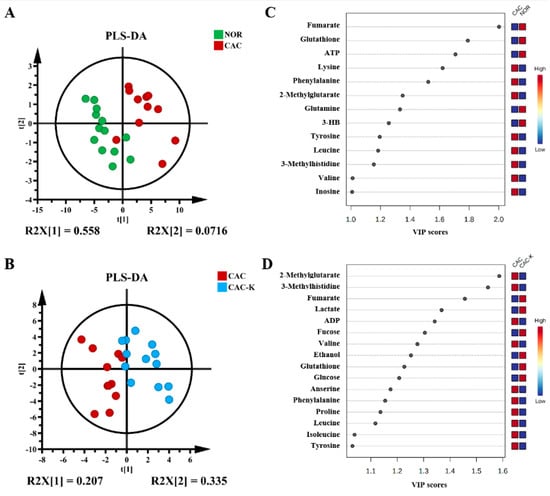 Multivariate statistical analysis for identifying significant metabolites from the comparisons of CAC vs. NOR and CAC-K vs. CAC. (A,B) Score plots of the PLS-DA models for CAC vs. NOR (A) and CAC-K vs. CAC (B). (C,D) VIP score-ranking plots of the significant metabolites identified by using the criterion of VIP > 1 calculated from the PLS-DA models of CAC vs. NOR (C) and CAC-K vs. CAC (D).