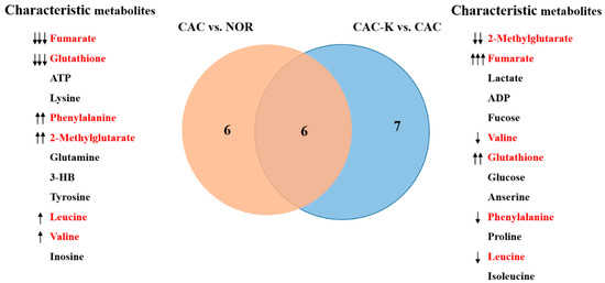 Venn diagram of the characteristic metabolites identified from pairwise comparisons of CAC vs. NOR and CAC-K vs. CAC. Characteristic metabolites were identified by using two criteria: VIP > 1 calculated from the PLS-DA model and p < 0.05 obtained from univariate analysis. Characterized metabolites highlighted in red were shared by pairwise comparisons. Note: ↑↑↑/↓↓↓, ↑↑/↓↓, and ↑/↓ represent that A was increased compared to B with a statistical significance of p < 0.05, p < 0.01, and p < 0.001, respectively.