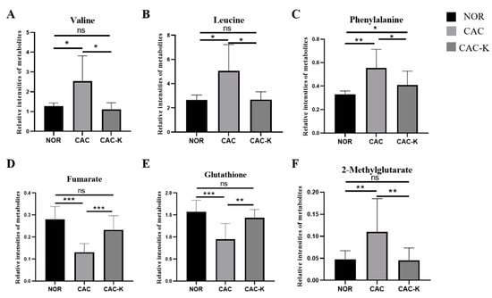 Quantitative comparisons of relative levels of the characterized metabolites shared by pairwise comparisons of CAC vs. NOR and CAC-K vs. CAC. (A) valine; (B) leucine; (C) phenylalanine; (D) fumarate; (E) glutathione; (F) 2-methylglutarate. Experimental data are represented as mean ± SD. Statistical significances: p > 0.05, ns; p <0.05, *; p < 0.01, **; p < 0.001, ***.
