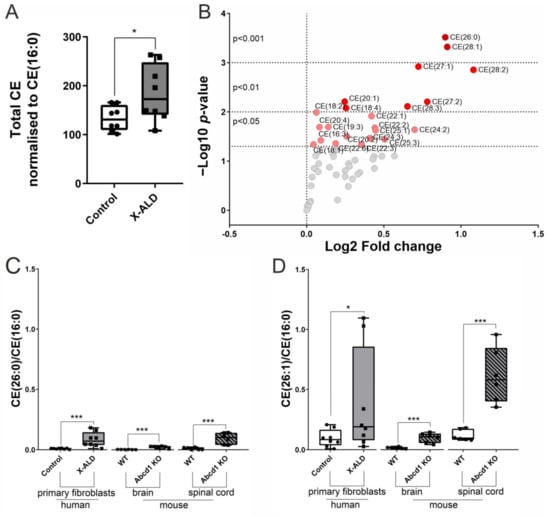 Cholesterol ester-fatty acid species are increased in primary human X-ALD fibroblasts and in the CNS of Abcd1 KO mice. (A–D) Lipidomic analyses were performed on control and X-ALD fibroblasts (n = 8 each) and on the brain and spinal cord of WT and Abcd1 KO mice (n = 6 each) using ultrahigh resolution liquid chromatography-mass spectrometry. The comparisons of total cellular cholesterol ester (CE) content (A) and CE-fatty acid composition (B) of control and X-ALD fibroblasts are displayed as a boxplot and volcano plot, respectively. The accumulation of CE-VLCFA species, represented by CE(26:0) in (C) and CE(26:1) in (D), was determined in human fibroblasts and murine CNS tissues and displayed as boxplots. All CE and CE(FA) levels were normalised to CE(16:0). Unpaired two-sided Student’s t-test was performed in (A). For (B–D), Qlucore Omics Explorer 3.5 software was used to analyse the lipidomic data statistically by conducting a two-group comparison test. The obtained p-values and log2-fold change values were used to create a volcano plot. The box plots (in (A,C,D)) show all the individual values and the median. * p < 0.05; *** p < 0.001.