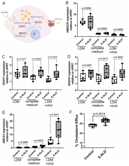 Imbalanced cholesterol homeostasis in X-ALD-derived fibroblasts leads to increased cholesterol efflux upon prolonged cholesterol loading. (A) Simplified schematic representation of cellular cholesterol turnover (FC, free cholesterol; LDs, lipid droplets). (B–E) Primary human control or X-ALD-derived fibroblasts (n = 6 each) were cultured for 5 days in lipid-depleted medium (LDM), RPMI with FBS (complete medium) or LDM supplemented with 10 μg/mL cholesterol (LDM + chol). RT-qPCR was carried out to determine the relative mRNA levels (normalised to HPRT1) of genes involved in cholesterol synthesis, HMGCR (B); cholesterol esterification, SOAT1 (C); cholesterol ester hydrolysis, NCEH1 (D); and cholesterol export, ABCA1 (E). (F) Cholesterol efflux was measured after 5 days of loading cholesterol in LDM + chol (control, n = 6; X-ALD, n = 9). The box plots in (B–F) show all individual values and the median. One-way ANOVA with Sidak’s multiple comparisons test was performed for statistical analysis of the data in (B–E). Unpaired two-sided Student’s t-test was performed in (F). The image in (A) was created using BioRender.com.