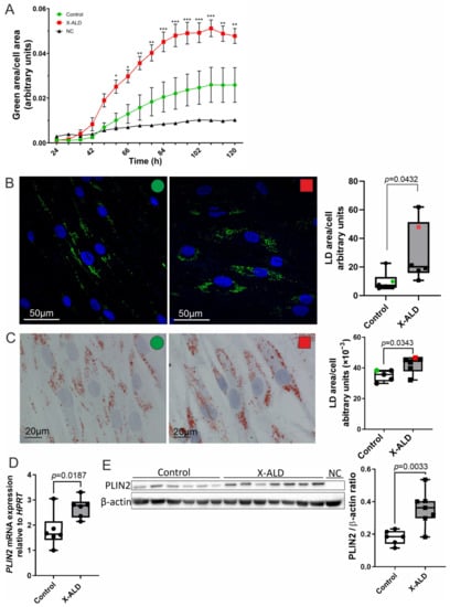 Increased lipid droplet induction upon prolonged cholesterol loading in X-ALD vs. control fibroblasts. (A–E) Control and X-ALD-derived primary fibroblasts were starved for 72 h in LDM and then incubated for 5 days with 10 or 20 µg/mL cholesterol in LDM. (A) The time course of LD formation induced by 20 µg/mL cholesterol treatment was monitored in four cell lines/genotype using the neutral lipid stain, BODIPY™ 493/503, and Incucyte® live-cell imaging. Cells were recorded from 24 h through to 120 h after adding cholesterol. The results are expressed as the fraction green fluorescence area/cell area. NC, normal control fibroblast line in LDM with 2% ethanol and BODIPY™ 493/503. The data are depicted as mean ± SD. Two-way ANOVA with Dunnett’s multiple comparisons test: * p < 0.05; ** p < 0.01; *** p < 0.001. (B–E) Fibroblasts (n = 6 per genotype) were exposed to 10 µg/mL cholesterol for 5 days before analysis. Representative confocal microscopy pictures (B) of control (left panel, green dot) and X-ALD (middle panel, red square) cells stained with BODIPY™ 493/503 (LDs, green fluorescence) and DAPI (nuclei, blue). Light microscopy pictures (C) of control and X-ALD cells stained with Oil Red O and haematoxylin. Images in (B,C) were analysed using ImageJ software and the results were expressed as LD area/cell (right panels). The microscopy views correspond to the colour-coded samples in the graphs. (D) Relative Perilipin 2 (PLIN2) mRNA levels, normalised to HPRT1, determined by RT-qPCR. (E) PLIN2 protein expression normalised to β-actin was assessed by western blot analysis: Original images could be found in Supplementary File—original-images. (E). In (B–E), the box plots show individual data points and the median; statistically significant differences determined using unpaired two-sided Student’s t-test are displayed as exact p-values.