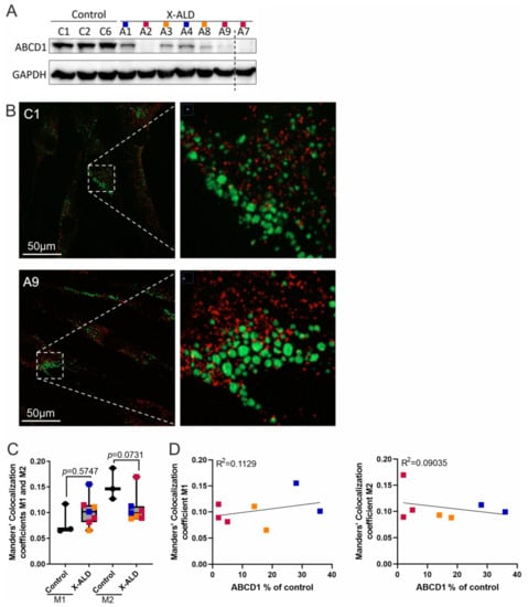 Low interaction between peroxisomes and lipid droplets under cholesterol-loading conditions in both control and X-ALD fibroblasts. (A) Western blot analysis depicting various levels of stable ABCD1 protein and GAPDH for normalisation of loading in the cell lines used for the co-localisation study in standard RPMI medium. The samples are colour-coded according to their ABCD1 content (blue, >20%; orange, 5–20%; red, <5%). A cut in the image is indicated by a dashed line; for the full set and quantification of ABCD1 protein levels, see Supplementary Figure S7. (B–D) Control (n = 3) and X-ALD-derived fibroblasts (n = 7) were starved in LDM, loaded with 20 µg/mL cholesterol for 72 h and stained with BODIPY™ 493/503 (for LDs) and anti-PMP70 antibody (for peroxisomes). Representative ultra-high resolution confocal images of LDs (green) and peroxisomes (red) and their interactions (yellow) in cholesterol-treated cells (control C1 and X-ALD A9) Original images could be found in Supplementary File—original-images (B). The extent of interaction between LDs and peroxisomes is expressed as Manders’ co-localisation coefficients, M1 (% of green pixel with red component) and M2 (% of red pixel with green component) (C), one-way ANOVA with Sidak’s multiple comparisons test. Linear regression analysis of the relationship between M1 or M2 and the level of mutated ABCD1 protein in X-ALD cells revealed no significant correlation (D).