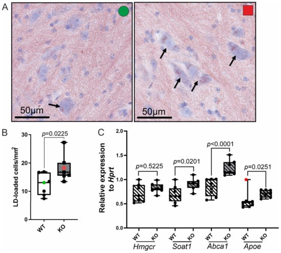 Furthermore, a recent whole-transcriptome analysis conducted on Abcd1-deficient BV-2 cells, a murine microglial cell model for X-ALD, revealed similar differences in cholesterol-related gene expression, with Soat1, Nceh1, Apoe and other genes related to the cholesterol efflux being significantly upregulated in mutant vs. WT BV-2 cells [63]. Nevertheless, also in this cell type, Raas and collaborators observed increases in Plin2 expression and LD abundance, despite the upregulation of cholesterol efflux genes. Intriguingly, BV-2 cells lacking Abcd1 displayed the accumulation of free cholesterol in the plasma membrane, as determined by flow cytometric analysis of Filipin III-binding kinetics. Generally, these differences were more pronounced in Abcd1/Abcd2 double-knockout BV-2 cells [63,64].