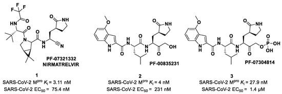 The nitrile warhead has a moderate electrophilic character. The electron-poor carbon of the nitrile group is able to undergo nucleophilic attack from the thiol group of the SARS-CoV-2 Mpro Cys145 residue to afford a reversible covalent thioimidate adduct [17]. In 2013, Chuck et al. demonstrated that nitrile-based peptidomimetics have broad-spectrum inhibition toward human coronaviruses Mpro [26]. This function has been taken into consideration by Pfizer’s scientists to develop the first oral drug for the treatment of COVID-19) [27]. This drug contains a SARS-CoV-2 Mpro bearing a nitrile warhead in P1′ called Nirmatrelvir (compound 1 in Figure 4). Beyond the P1′ warhead, Nirmatrelvir embodies a P1 γ-lactam moiety that resembles the Gln residue of the native substrate and acts as a recognition motif for the S1 pocket. The introduction of the dimethylcyclopropyl proline moiety at the P2 position was made to achieve a deep fit within the S2 subsite. The N-terminal recognition unit is composed of a trifluoroacetamide group that provides interaction with the S3/S4 subpocket and gives the compound better pharmacokinetic properties. The discovery and development of Nirmatrelvir started from two hit compounds: PF-00835231 (2 in Figure 4), an α-hydroxy ketone-based peptidomimetic, and the corresponding phosphate prodrug PF-07304814 (3 in Figure 4), developed by Pfizer Inc (NYSE: PFE). against SARS-CoV during the 2002 SARS outbreak [27]. Both compounds were selected as SARS-CoV-2 Mpro inhibitors for in vitro and in vivo biological evaluation, showing promising results as intravenously administered drug candidates. In particular, PF-00835231 showed high potency (Ki = 4 nM) and good antiviral activity (EC50 = 231 nM) [28].